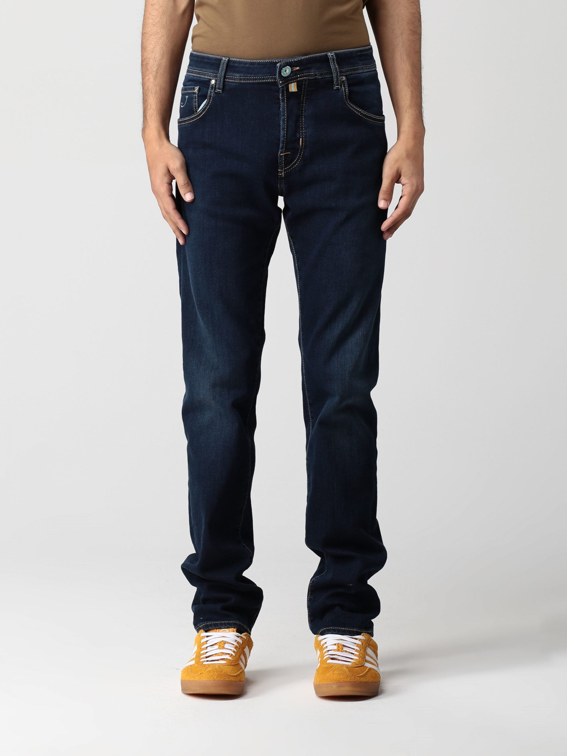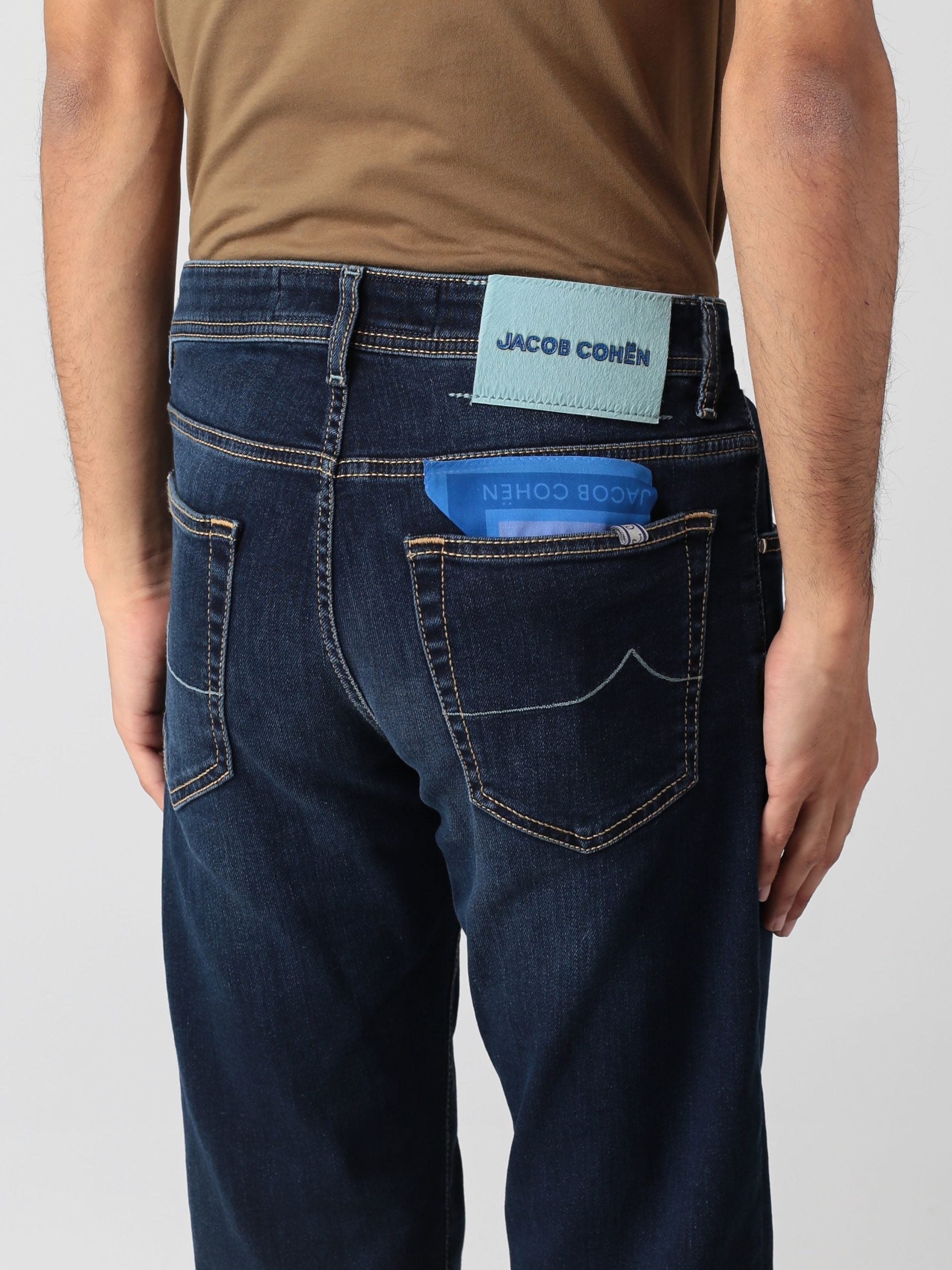 Jacob Cohen denim, blue color, 5-pockets design, turqoise back patch in pony skin, front buttons closure. Made in Italy